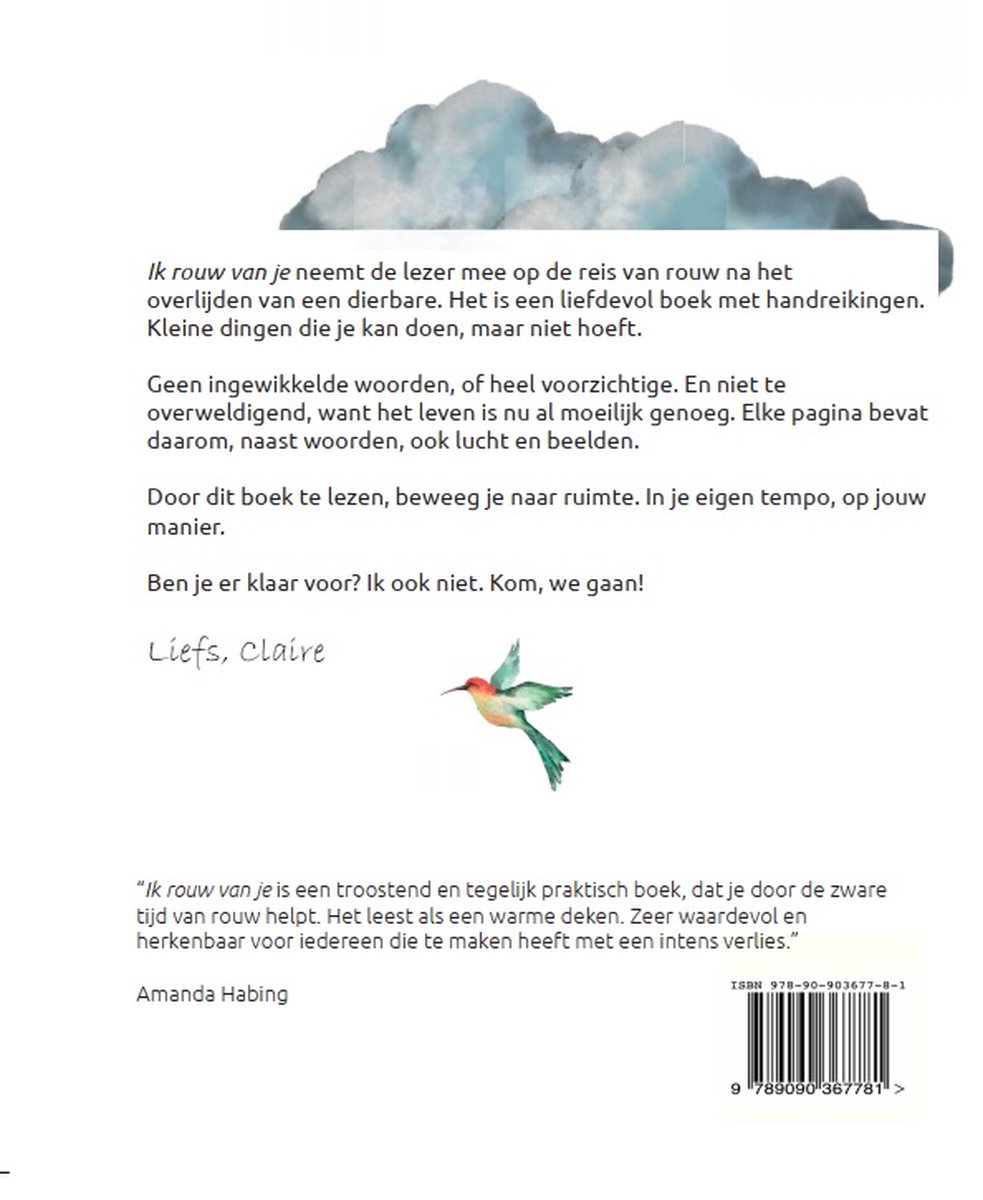 Claire van ’t Veen — Ik rouw van je (Paperback) is een compact, toegankelijk boekje over rouw na een overlijden. Het is geschreven als houvast in een moeilijke periode: korte teksten per pagina, liefdevolle handreikingen en een dyslexievriendelijke, extra grote opmaak die het lezen tijdens emotionele kwetsbaarheid vergemakkelijkt.