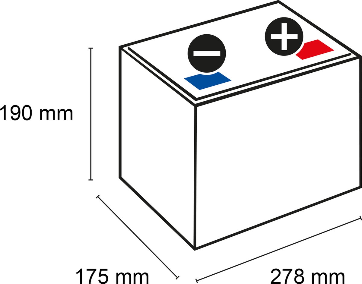 | Product afmetingen (L×B×H) | 278 × 175 × 190 mm | Belangrijk voor plaatsing; meet accubak en zorg dat zijruimte en klemmen passen. |
