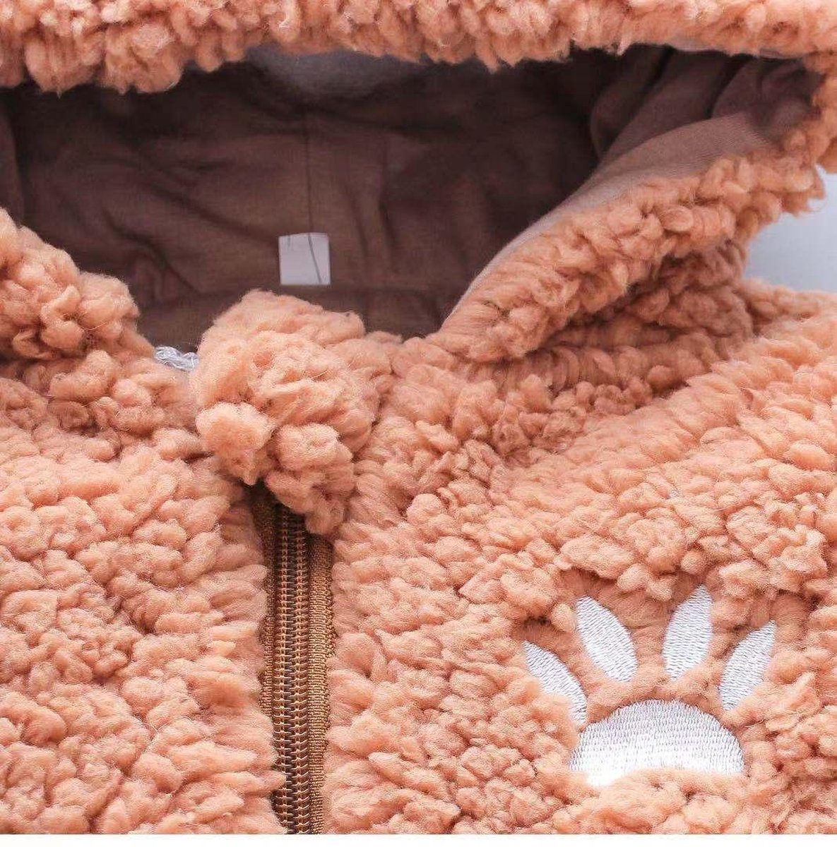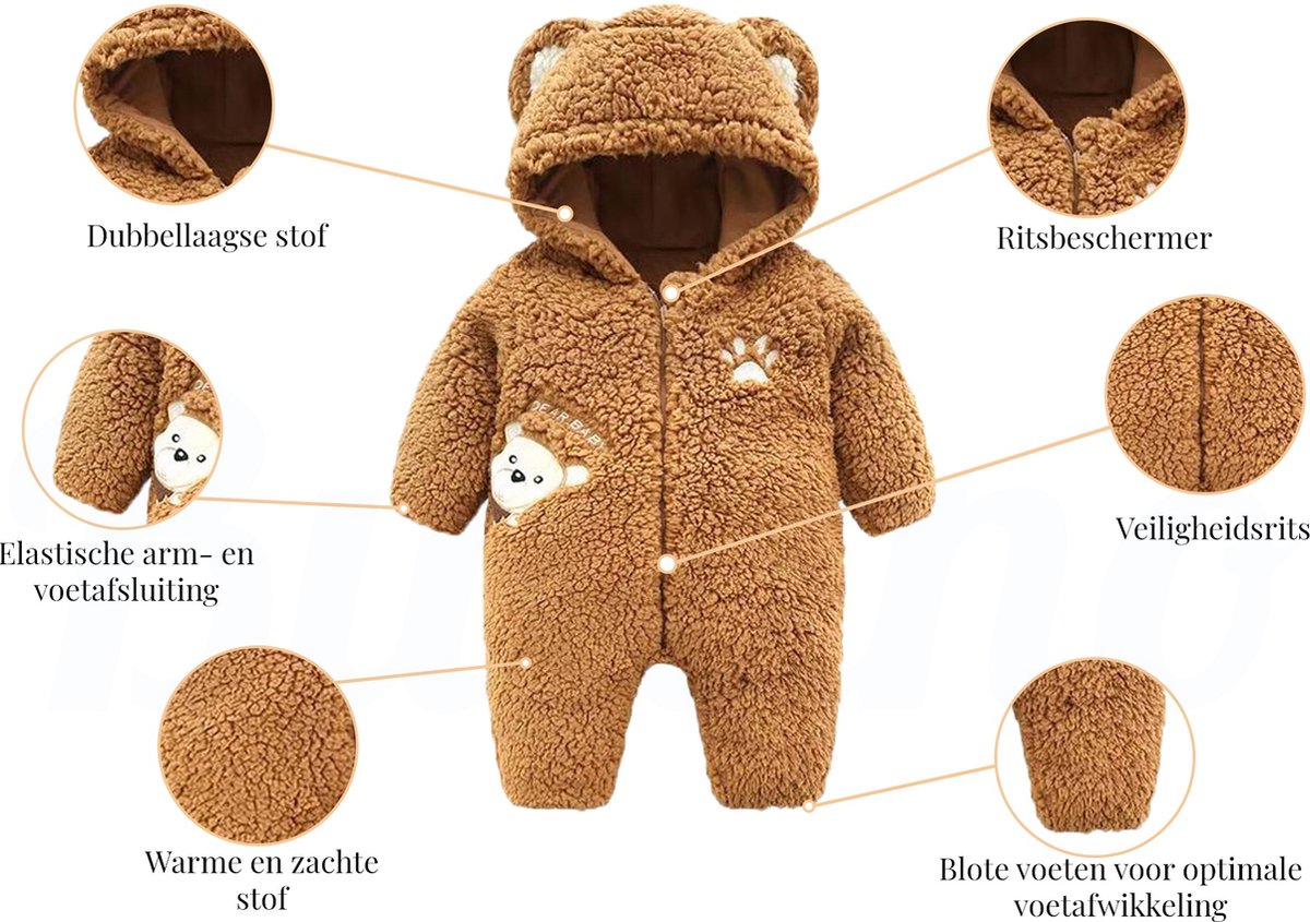 Het ontwerp is eenvoudig en praktisch: een effen bruin boxpakje met dier-thema (beer) en lange mouwen. De hals- en rompconstructie lijkt gericht op gemak bij aan- en uitkleden door de aanwezigheid van een rits. Doordat het model geen voetjes heeft, combineer je het pakje makkelijk met sokjes of losse slofjes. De gebruikte stofconstructie is fleece, wat aangeeft dat het pakje vooral gericht is op warmte en comfort in koelere omstandigheden. Wij verwachten dat het model zowel voor dagelijks gebruik als voor verkleedmomenten geschikt is.