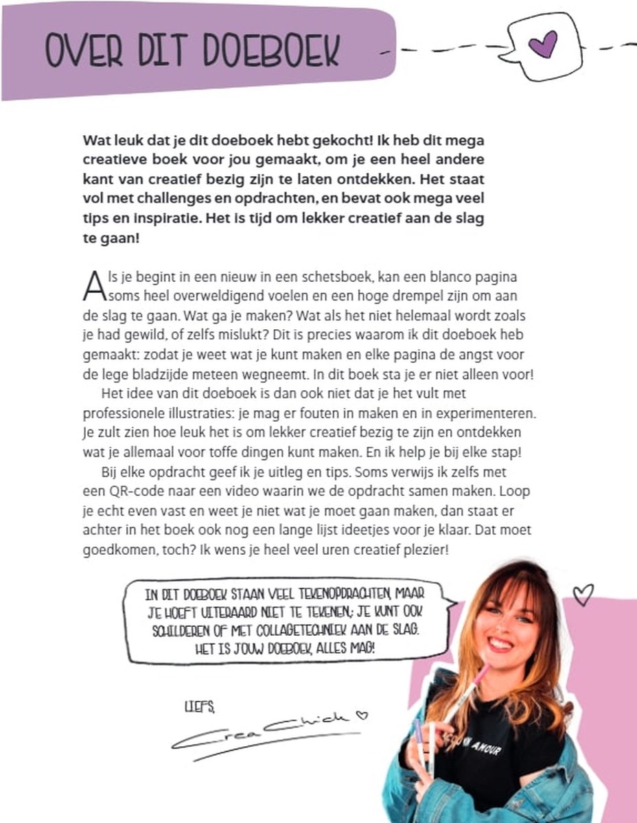 Het CreaChick Doeboek is een Nederlandstalig, geïllustreerd paperbackboek van 128 pagina’s dat zich richt op tekenopdrachten, challenges en oefeningen. Het boek belooft praktische handvatten, tips en voorbeelden van Creachick om creatieve blokkades en de angst voor een lege pagina te verminderen. Met compacte afmetingen en een lichte hardcover-achtige dikte is het bedoeld als inspiratie- en oefenboek, uitgegeven door BBNC Uitgevers.