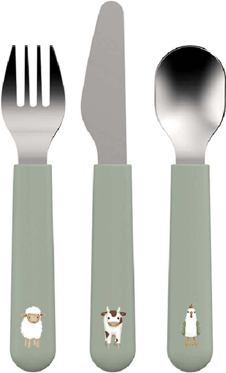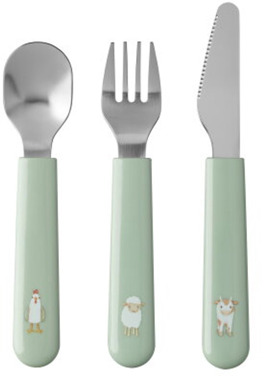 De Mepal Mio kinderbestek Little Farm – 3-delig is een basisset voor jonge kinderen die zelfstandig willen leren eten. De set bevat een vork, een mes (alleen aan één kant snijdend) en een lepel, met roestvrijstalen bestekdelen en kunststof (ABS) handvatten in het Little Farm-design. De set is vaatwasserbestendig, 100% BPA-vrij en geschikt voor kleintjes vanaf ongeveer 12 maanden. Fabrikantgegevens (overige informatie) zijn niet vermeld in de productdata.