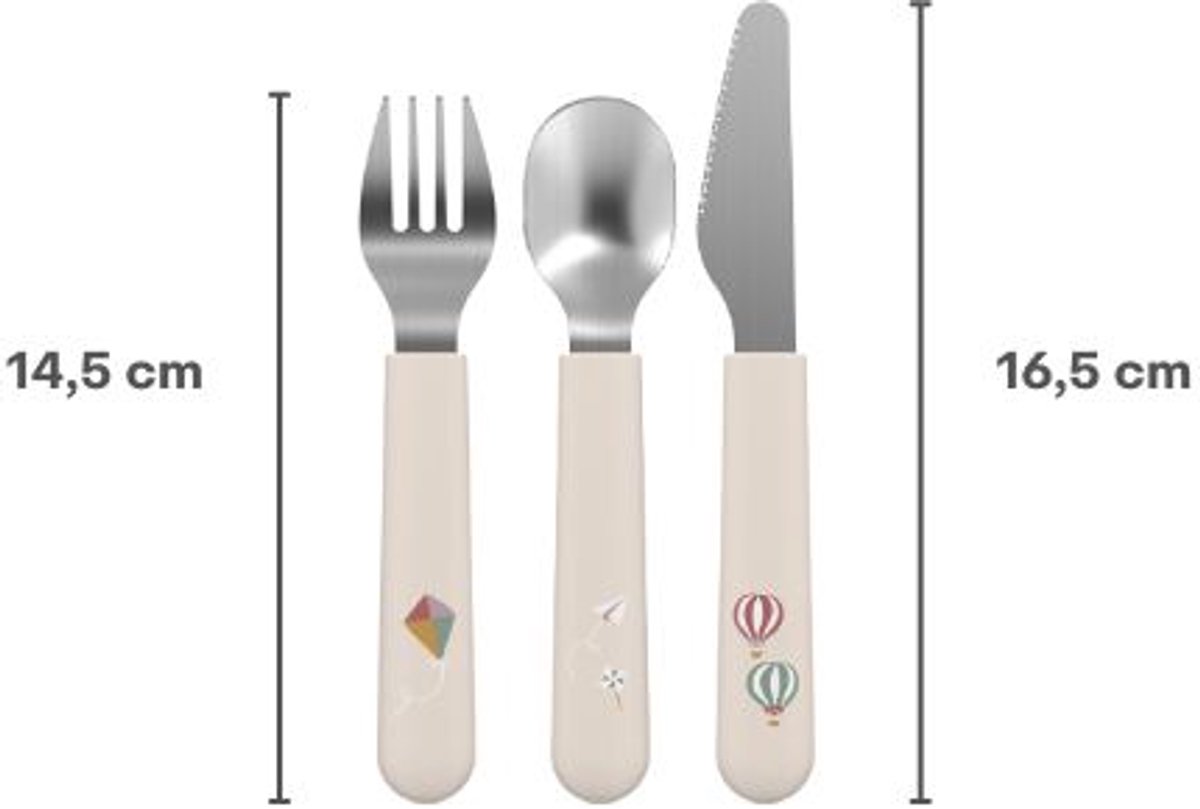 | Materiaal | ABS, Roestvrij staal | Roestvrij staal is duurzaam en hygiënisch; ABS-handvatten bieden comfort en een licht gewicht waardoor het bestek makkelijker vast te houden is voor kleine handen. |