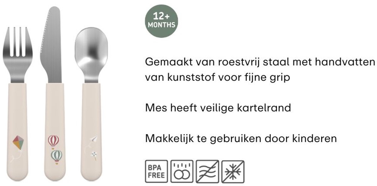 | Aantal delen | 3 (vork, mes, lepel) | Compleet basissetje voor één kind: de belangrijkste bestekstukken zijn aanwezig om kinderen te leren eten. |