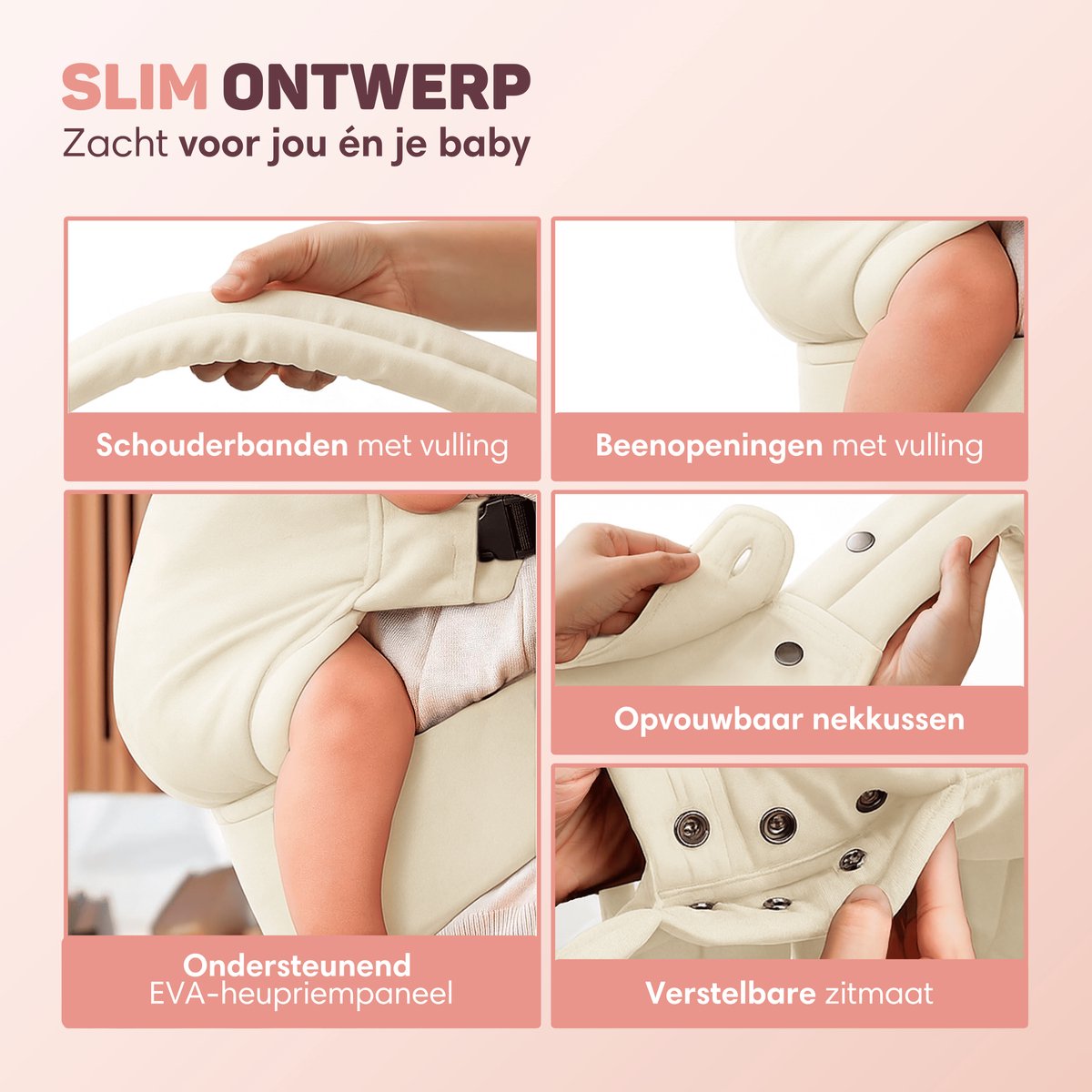 De draagzak heeft een rustige crèmekleur met een subtiel logo en een luxe afwerking. De drager is opgebouwd rond een comfortabele, gewatteerde basis met zachte beenzones en een geïntegreerd EVA‑rugsteunpaneel dat stabiliteit in de onderrug moet bieden. Schouderbanden kruisen in een X‑vorm op de rug, wat volgens de productgegevens een betere verdeling van het gewicht geeft dan traditionele H‑modellen. De stof is 100% ademend katoen, wat zorgt voor een zacht en luchtig draagvlak. De sluitingen werken met verstelbare gespen en kliksystemen. Verpakkingsgewicht en -afmetingen staan in de data, maar het daadwerkelijke productgewicht is niet vermeld in de productdata.