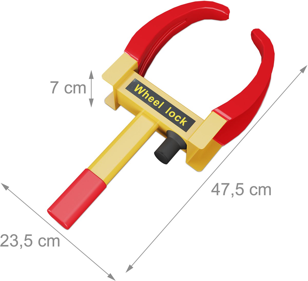 De klem is gemaakt van staal met een beschermende coating en heeft kunststof (pvc) onderdelen. Met afmetingen van ongeveer 47,5 x 23,5 x 7 cm en een handvat van ca. 21,5 x 5 x 3 cm is het apparaat compacter dan sommige professionele modellen maar nog steeds groot genoeg om een wiel effectief te blokkeren. Het totaalgewicht is rond 1,8 kg, wat licht genoeg is om gemakkelijk te hanteren en op te bergen maar toch voldoende massa heeft om fysieke manipulatie lastiger te maken.